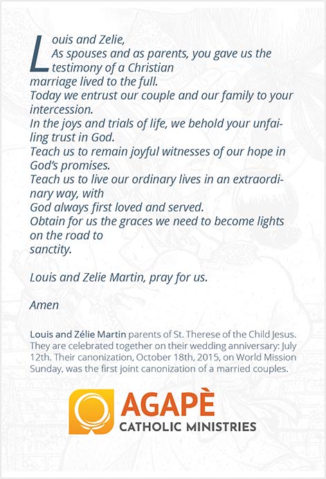 Prayer card for marriage to Sts. Louis and Zelie Martin, first couple to be canonized as a couple.